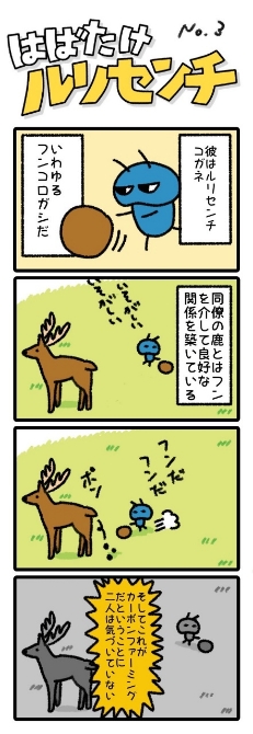 奈良SDGs学び旅のWebサイトにて、4コマ漫画「はばたけルリセンチ」のこれまでのお話が読めるようになりました。奈良公園を舞台に、ルリセンコガネと愉快な仲間たちが繰り広げる日常ドタバタコメディ「はばたけルリセンチ」、どうぞお楽しみください。